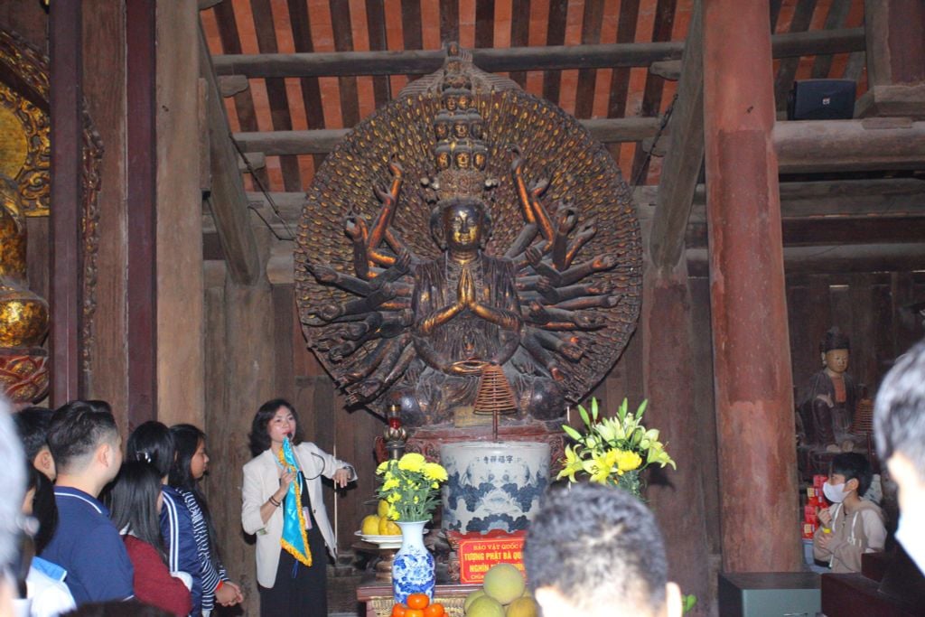 At this ancient pagoda, students admired the Thousand-Handed, Thousand-Eyed Guanyin statue, a unique masterpiece of Vietnamese art, listened to Buddhist stories, and felt the serenity of the sacred space.