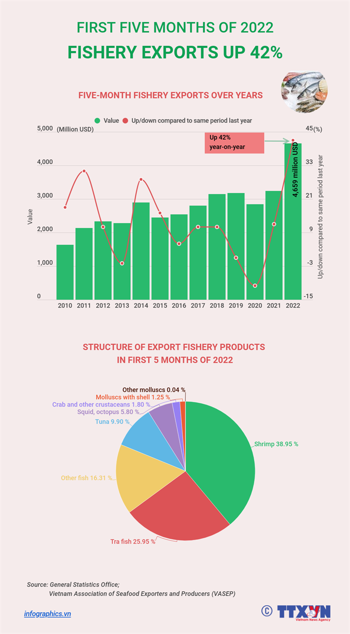 Fishery export turnover this May hit the 1-billion-USD benchmark, posting a year-on-year rise of 27 percent and bringing the figure in the first five months of the year to more than 4.6 billion USD, up 42 percent compared to the same period of 2021.