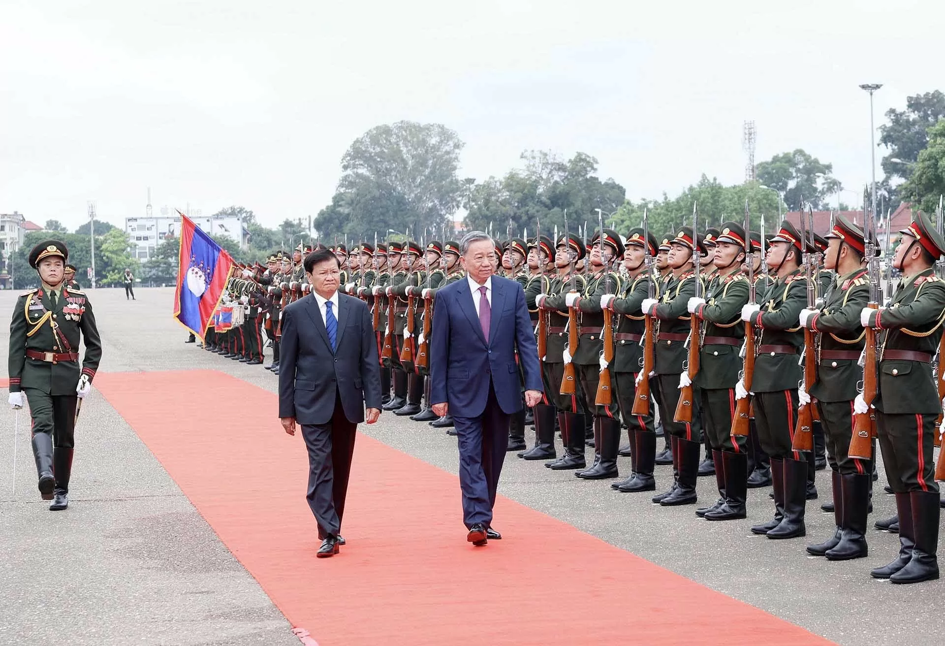 | President To Lam and General Secretary, President of Laos Thongloun Sisoulith inspected the honor guard. (Source: VNA) |