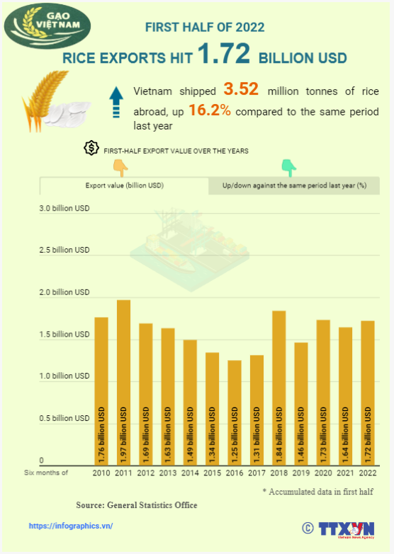 Vietnam exported 3.52 million tonnes of rice in the first half of 2022, for a year-on-year rise of 16.2%, raking in about 1.72 billion USD. Rice was one of 28 commodities with export revenue exceeding 1 billion USD in the first half.