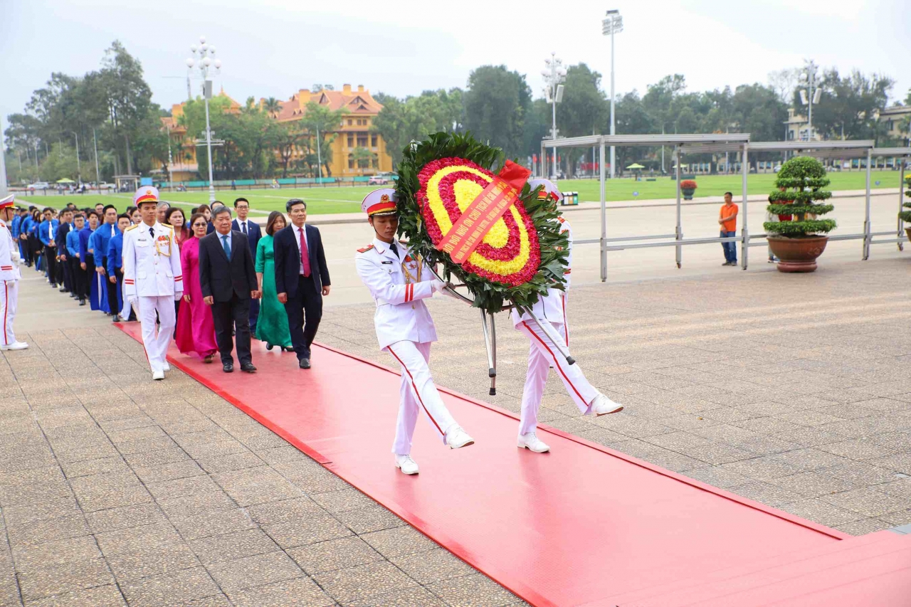 On the same day, 150 exemplary youth members representing the youth of the Ministry of Culture, Sports and Tourism, the Ministry of Foreign Affairs, the Ministry of Science and Technology, Vietnam News Agency, Vietnam Electricity, and the State Capital Investment Corporation visited the Ho Chi Minh Mausoleum to respectfully report to Uncle Ho.